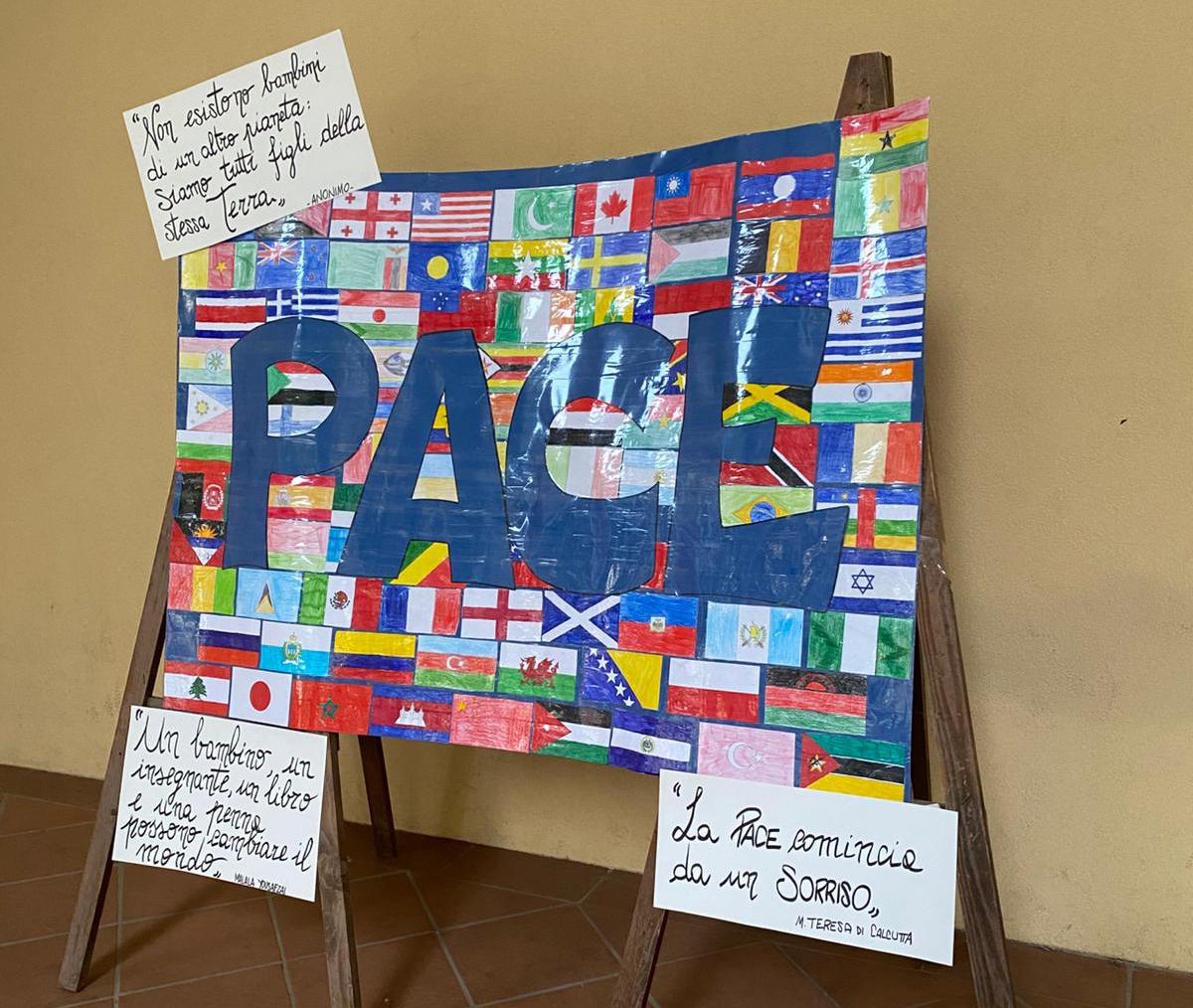 Disegni di bandiere delle nazioni di tutto il mondo, cartelloni raffiguranti piramidi, metafore per costruire mattone su mattone azioni di pace, hanno tappezzato le pareti della scuola, unitamente a striscioni appesi alle entrate e alle finestre delle classi, nell’intento di far arrivare all’esterno pensieri e sentimenti fortemente condivisi.