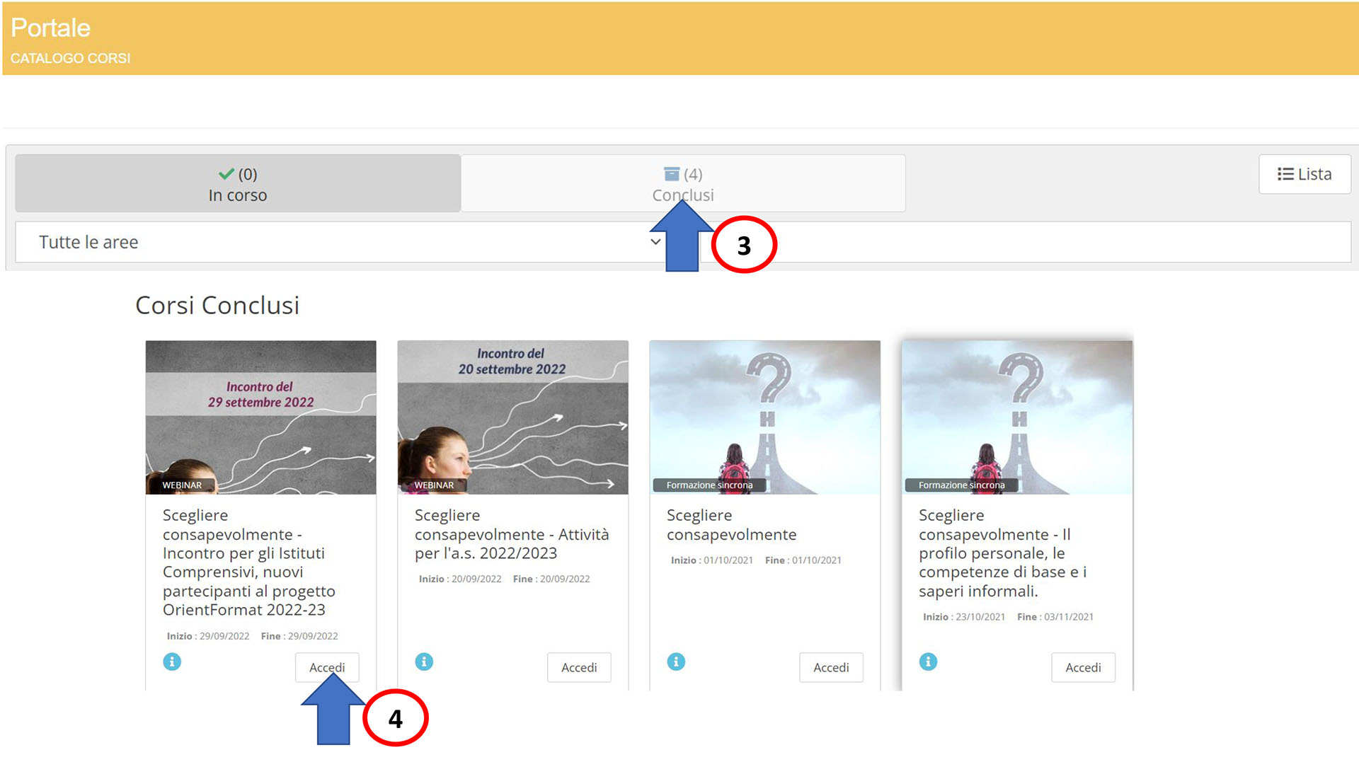4. Poi nella lista dei corsi conclusi selezionare il webinar che si vuole vedere o rivedere e cliccare su "Accedi".