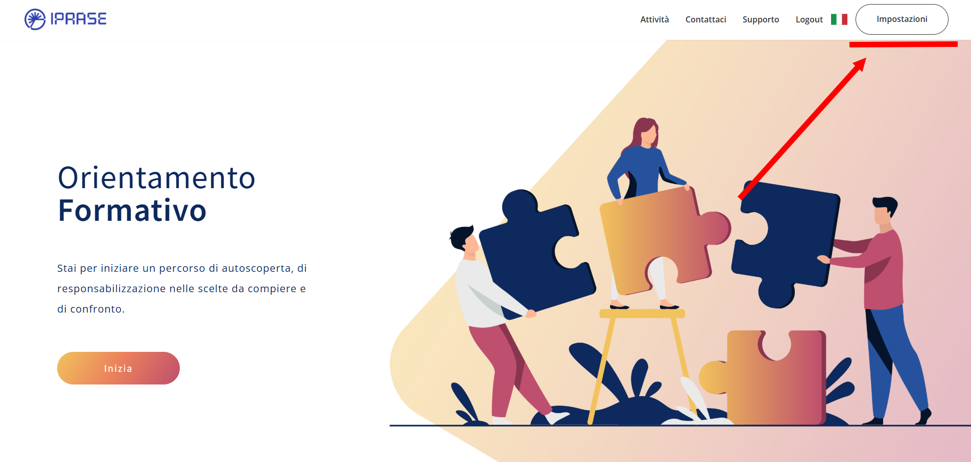 2. Una volta in possesso del codice, devi effettuare normalmente l’accesso. Dopo essere entrato/a nella piattaforma, clicca sul pulsante "Impostazioni" nella barra di navigazione: si aprirà così la pagina in cui è possibile selezionare la nuova classe.