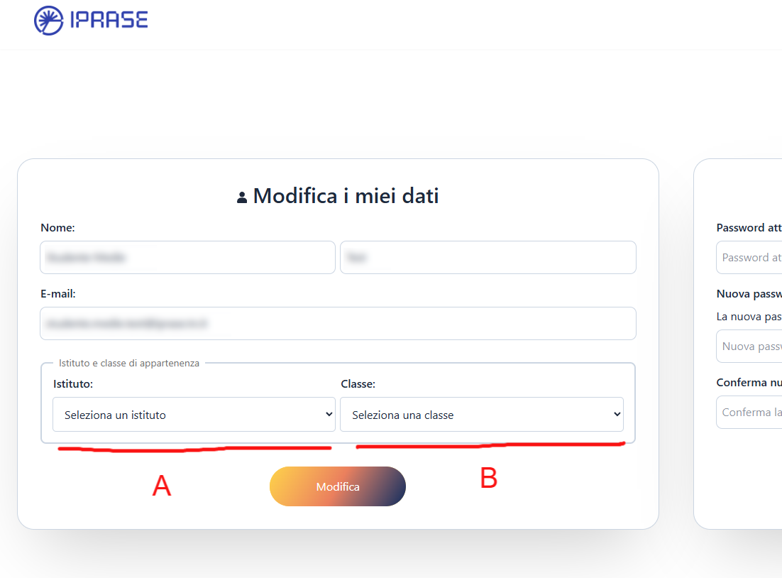 3. In questa pagina, come prima cosa seleziona il tuo Istituto (A), poi la tua nuova classe (B).