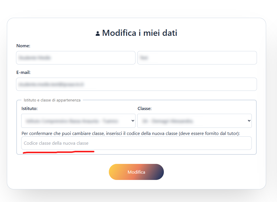 4. Una volta selezionata la classe, apparirà il campo per inserire il codice della classe che hai richiesto in precedenza. Inseriscilo e poi clicca su "Modifica". Fatto questo, avrai cambiato classe con successo.