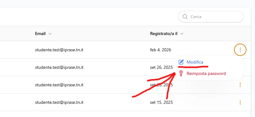 1. Come prima cosa nella lista degli studenti bisogna cliccare sui 3 puntini a lato dello studente da spostare, per aprire la lista delle azioni disponibili.