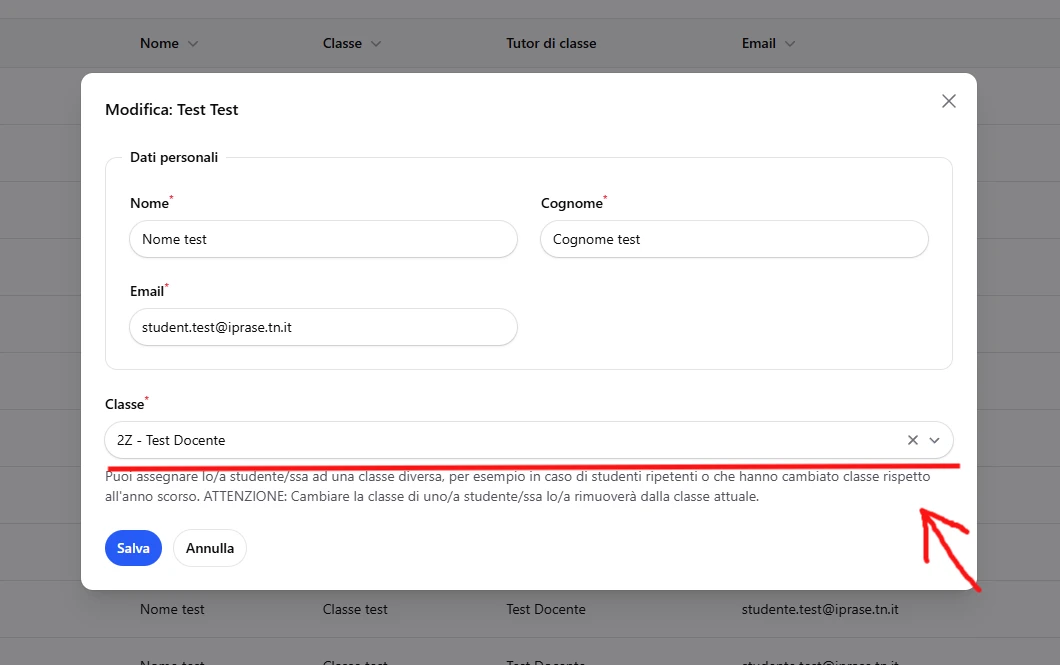 3. Verrà aperta una finestra con la scheda dello studente. Sotto alla voce "Classe" selezionare la nuova classe di destinazione. Una volta fatto, cliccare su "Salva"